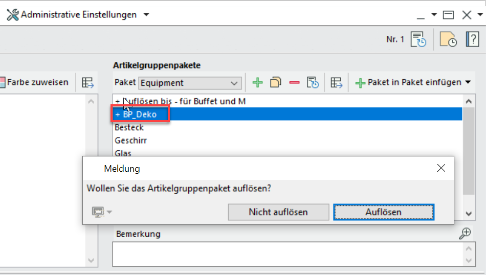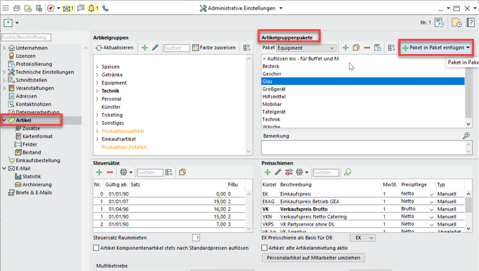 Unter Administration > Allgemeine Einstellungen > Artikel > Artikelgruppenpakete > Paket in Paket einfügen ergänzen Sie Ihre Artikelgruppenpakete um ganze andere Pakete. Mit Doppelklick lösen Sie die Pakete ggf. auf. In Listen verhalten sich die eingefügten Pakete genauso wie einzeln eingefügte Gruppen.
