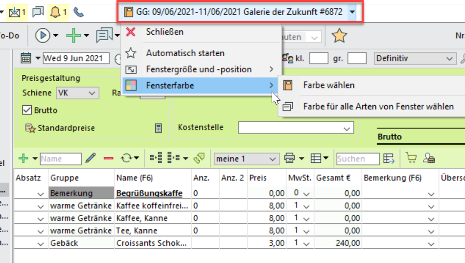 Fenster individualisieren: Für viele Fenster gibt es auch eine Autostart-Funktion, so dass die Fenster nach dem Anmelden sofort automatisch geöffnet werden (IC, TAPI, Erinnerungen, E-Mail-Eingang etc.). Diese Funktion und die Zuweisung einer benutzerdefinierten Fensterfarbe finden Sie ebenfalls mit Klick auf den Aufklapp-Pfeil neben dem Fenstertitel in der Mitte der Titelleiste.