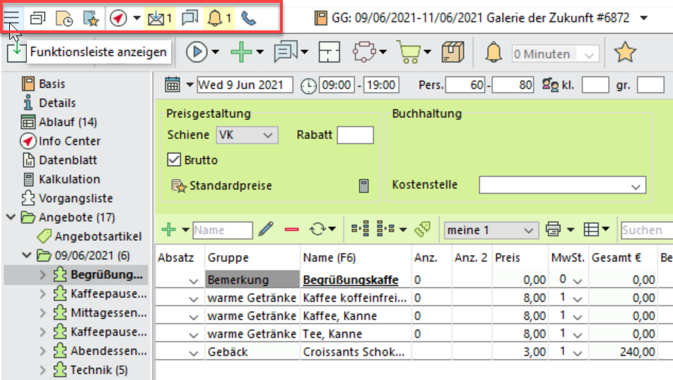 Weitere Funktionen aus dem Schnellzugriff der Version 11 finden Sie jetzt oben links in der Titelleiste, wie den E-Mail-Eingang, die Internen Nachrichten, die Erinnerungen und ggf. den Ereigniskalender.