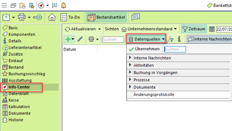 Als Datenquellen stehen zur Verfügung: - Interne Nachrichten - Aktivitäten - Buchungen in Vorgängen - Prozesse - Dokumentenpakete - Änderungsprotokolle Neu anlegen können Sie: - Prozesse - Aktivitäten - Dokumentenpakete