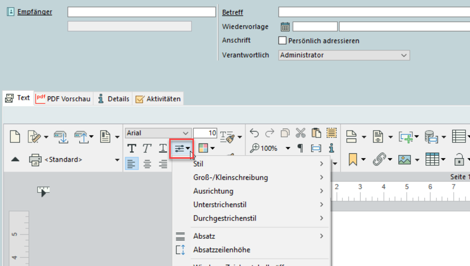 Weisen Sie Schriftstile zu, formatieren Sie Absätze oder fügen Sie Sonderzeichen über die Werkzeugleiste der Reiters Text in Ihre Briefe, E-Mails oder Vorlagen ein.