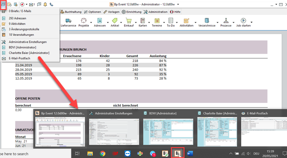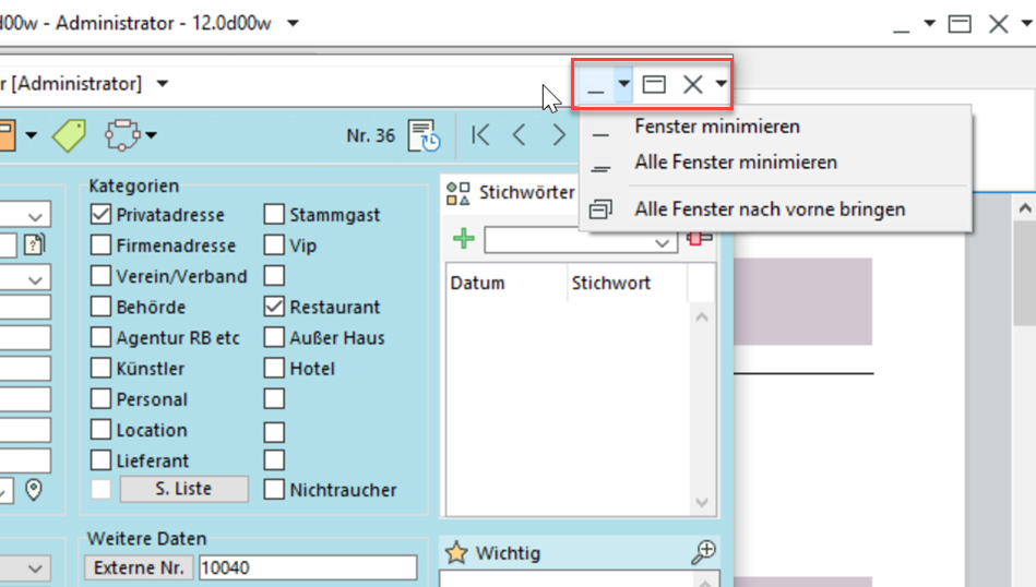 Über das Icon "Alle geöffneten Fenster zeigen" (zweites Icon von links in der Titelleiste) sehen Sie alle offenen Fenster und die zuletzt geöffneten Listen. Holen Sie einzelne Fenster mit Linksklick in den Fokus (auch über Funktionstaste F3). Alle geöffneten Datensätze, egal ob minimiert oder sichtbar, sehen Sie außerdem in der Windows-Taskleiste am unteren Rand des Bildschirms. Über die Funktionstaste F2 bringen Sie ausserdem alle Fenster, die gerade nicht sichtbar sind, wieder in den sichtbaren Bereich.