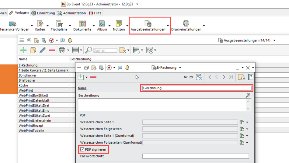 Geben Sie dafür unter Allgemeinen Einstellungen bzw. Betriebseinstellungen > Rechnungsverwaltung eine entsprechende XML-Export-Liste sowie das gewünschte ZUGFeRD-Format an. In den Ausgabeeinstellungen geben Sie an, ob das PDF signiert werden soll oder nicht.