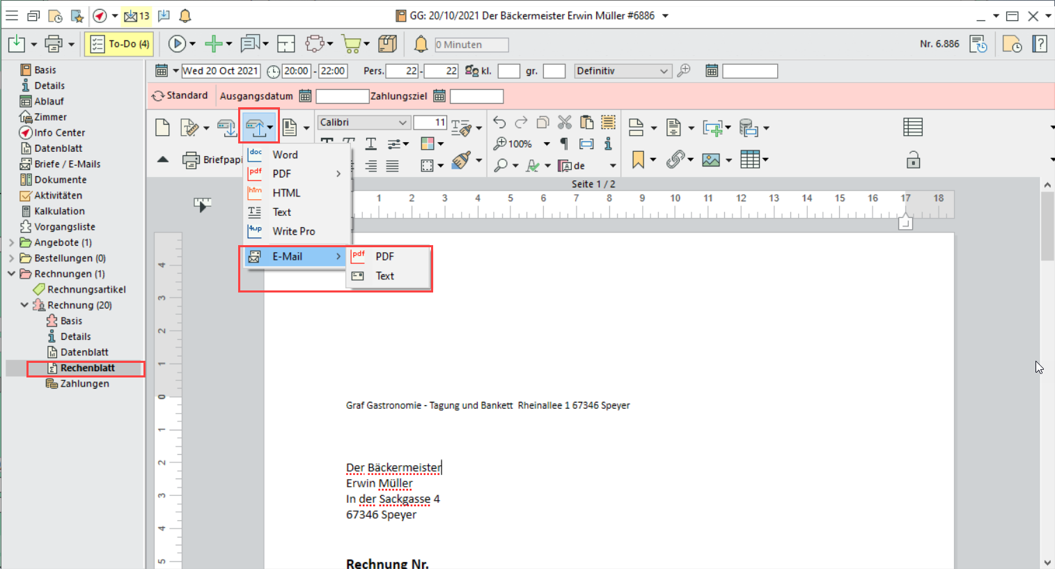 Nur Versionen älter als 12.1p25: Versenden Sie Rechnungen im ZUGFeRD-Format, indem Sie im Rechenblatt die Druckoption "E-Mail" wählen.