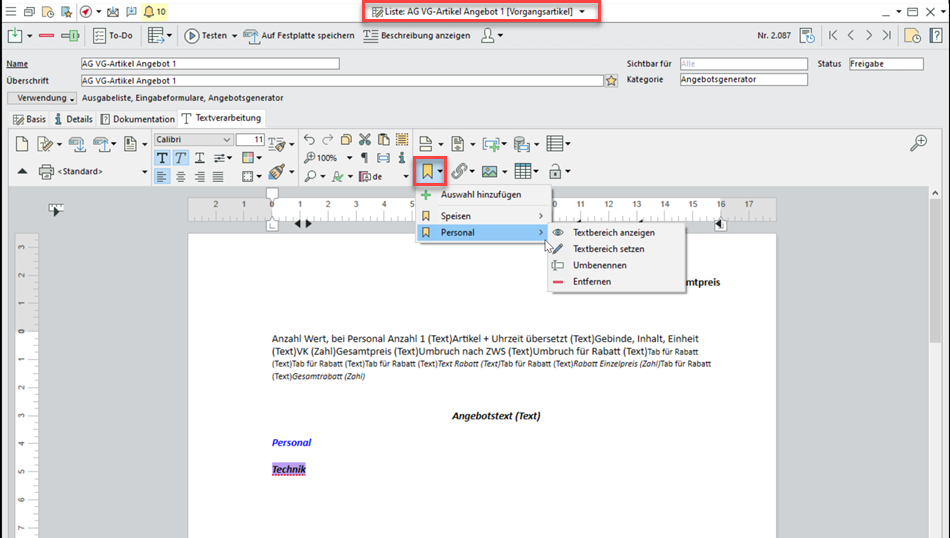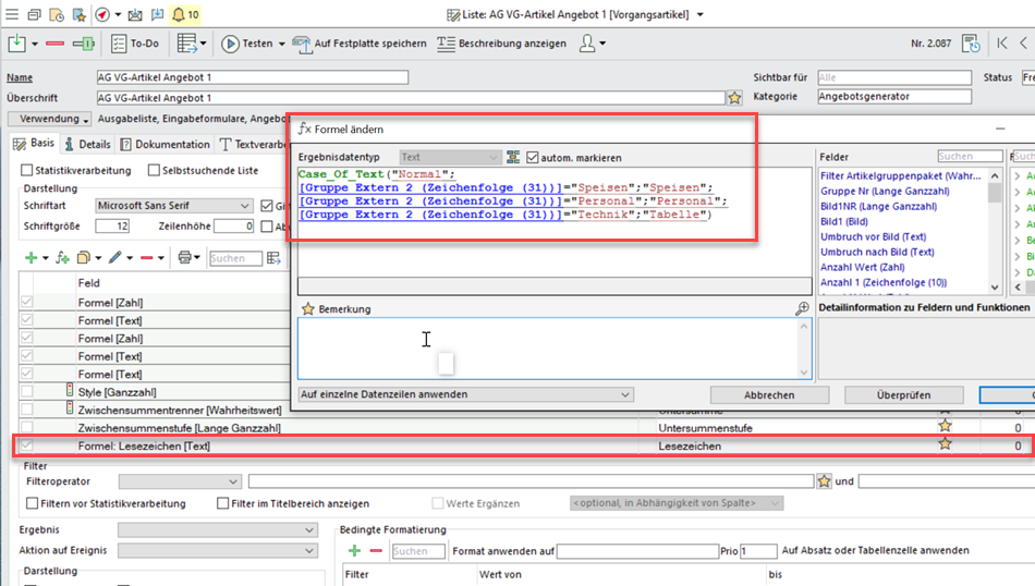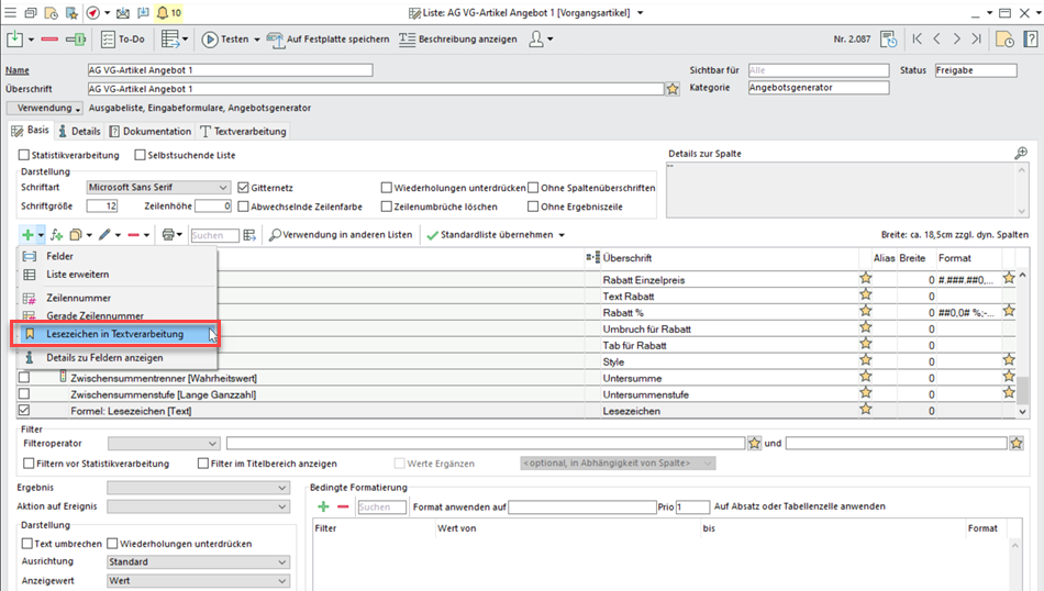 Weisen Sie mit dem Angebotsgenerator in Listen Textformate pro Datenzeile zu, in Abhängigkeit zum Beispiel von der Artikelgruppe.