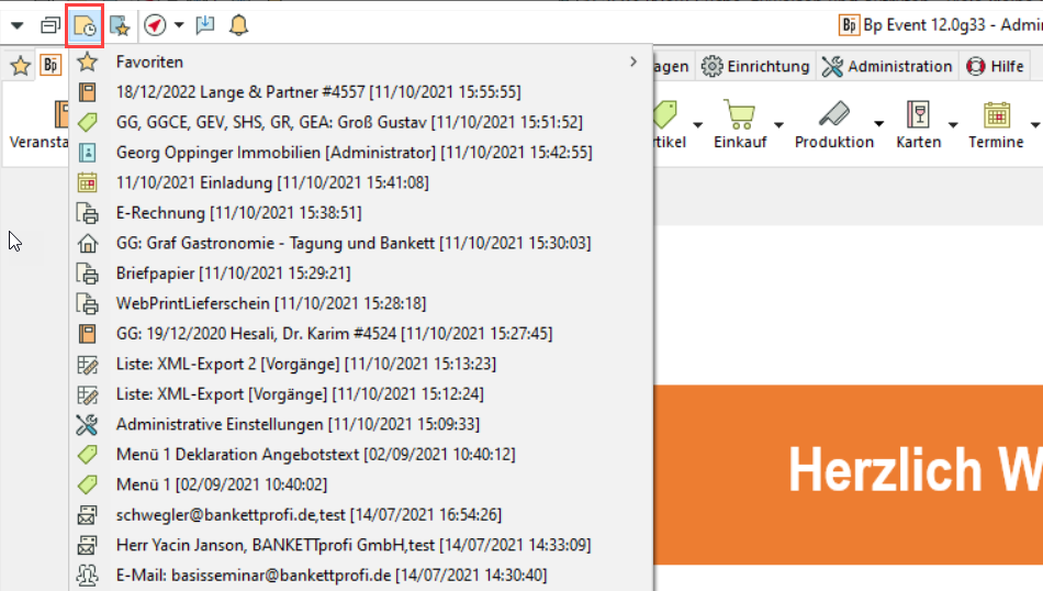 Verknüpfungen zu den zuletzt geöffneten Datensätzen aller Tabellen finden Sie z.B. über das Tastaturkürzel F3 oder über das Icon Zuletzt geöffnet im Schnellzugriff oben links.