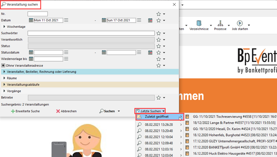Die letzten Datensätze aus einer ausgewählten Tabelle werden angeboten, wenn Sie entweder die Suche > Letzte Suchen öffnen, oder das Icon Zuletzt geöffnet oben rechts in einem Datensatz anklicken.