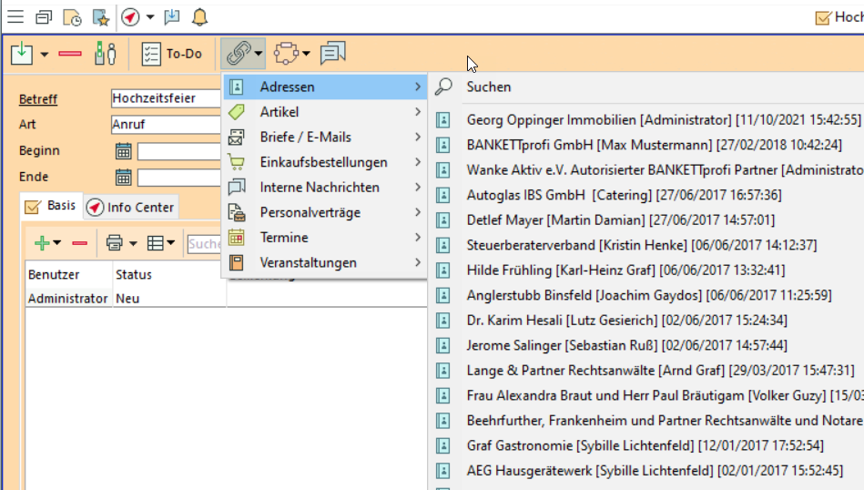 Auch für die nachträgliche Verknüpfung von Terminen, Aktivitäten oder Briefen werden die zuletzt verwendeten Datensätze angeboten, ebenso in Tabellendetails vom Typ Verknüpfung und manchen anderen Fremdschlüsselfeldern.