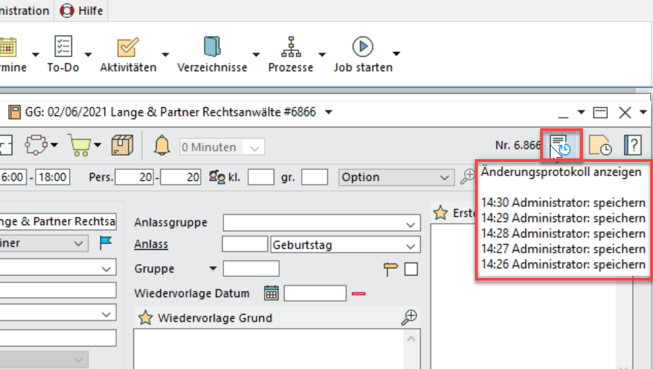 Es werden angezeigt: Datum (wenn nicht heute), Uhrzeit, Benutzer und Aktion.