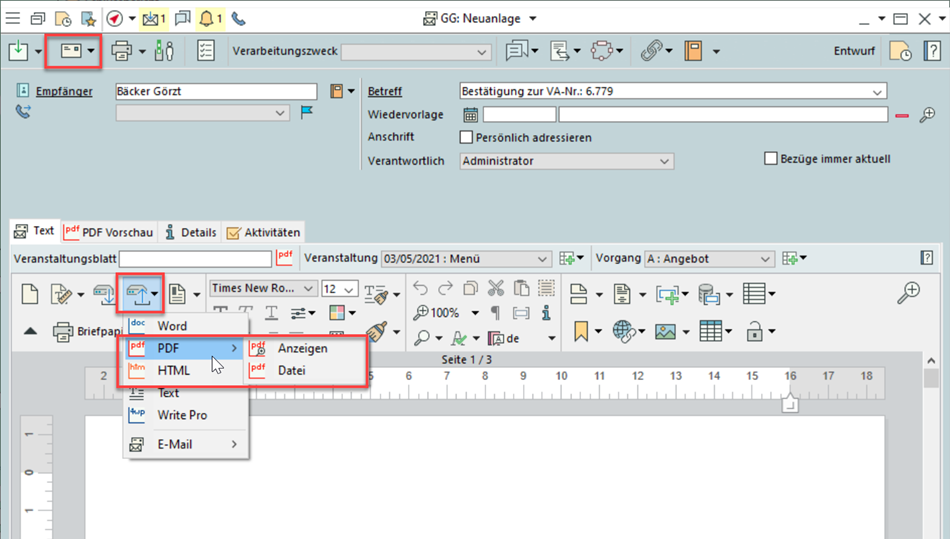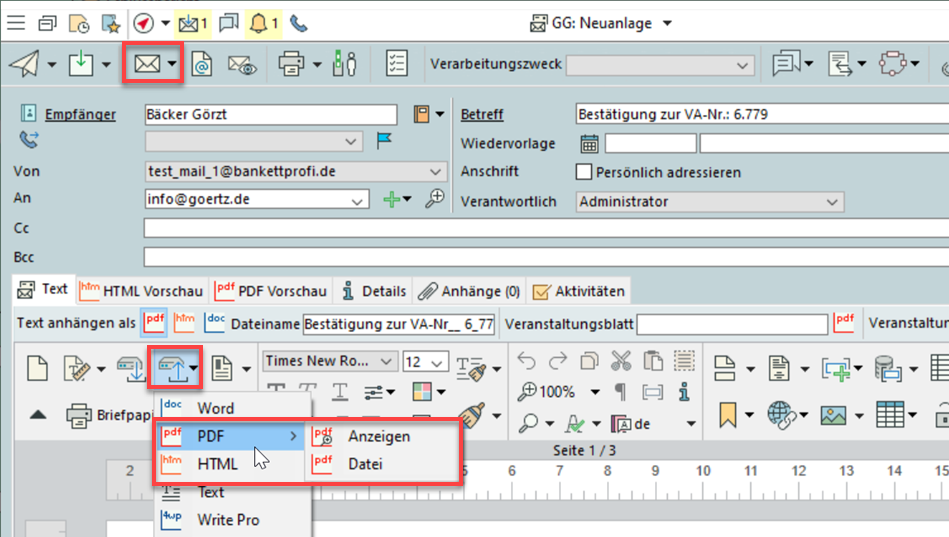 Briefe oder E-Mails speichern Sie ohne Umweg über einen PDF-Drucker jetzt direkt über das Icon "Datei speichern unter" in der Werkzeugleiste des Briefes.