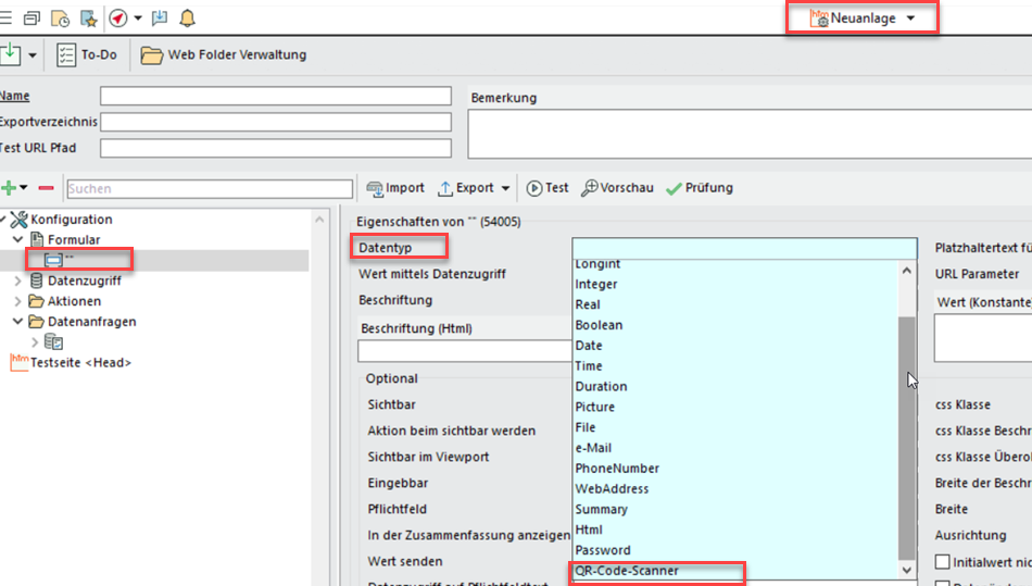 Die Kamera schließt automatisch, sobald ein QR-Code erkannt wird. Das Ergebnis wird dann in das entsprechende Feld eingetragen und kann z.B. über "Aktion nach Wertänderung" weiterverarbeitet werden.