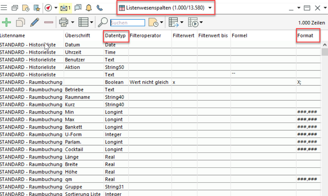 Listenwesenspalten mit Datenformaten, die nicht zum zugewiesenen Datentyp passen, sind über die Ergebnisliste mit den Spalten "Format" und "Datentyp" jetzt leichter zu finden und zu korrigieren.