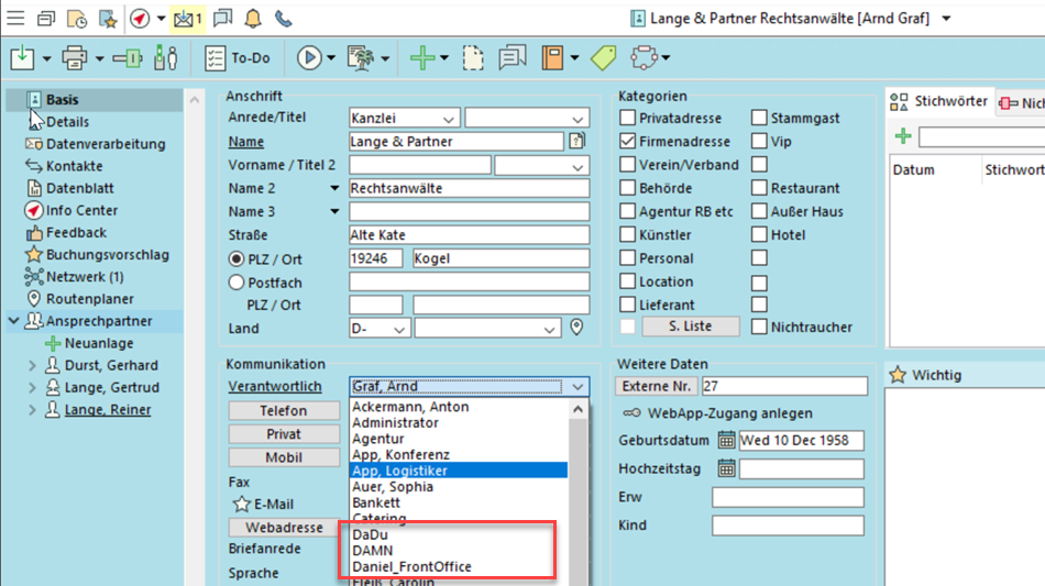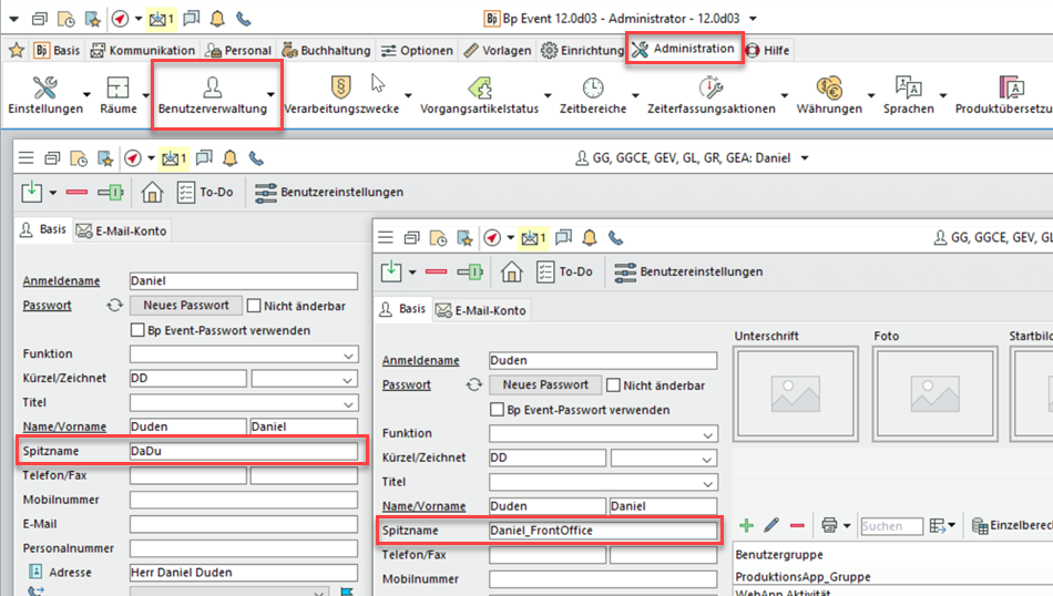 Unter Administration > Benutzerverwaltung legen Sie verschiedene Spitznamen an, über die der Benutzer identifiziert und ausgewählt werden kann. Die Felder "Name" und "Vorname" können so gleich bleiben und werden in der Signatur von Briefen/E-Mails korrekt widergegeben.