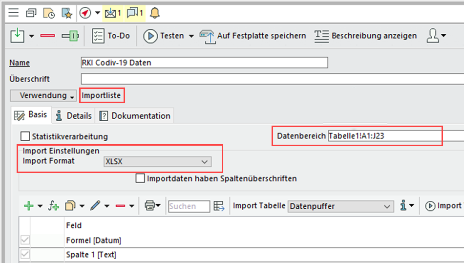 Weisen Sie Ihrer Importliste das Format "XLSX" zu und bestimmen Sie den Datenbereich, aus dem die Daten übernommen werden sollen.