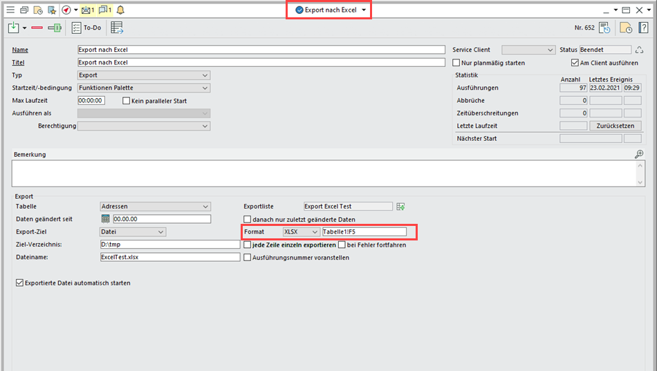 Im Export-Job wählen Sie den Typ "Export", definieren Exportliste sowie Export-Ziel und weisen das Format "XLSX" mit Datenbereich zu.