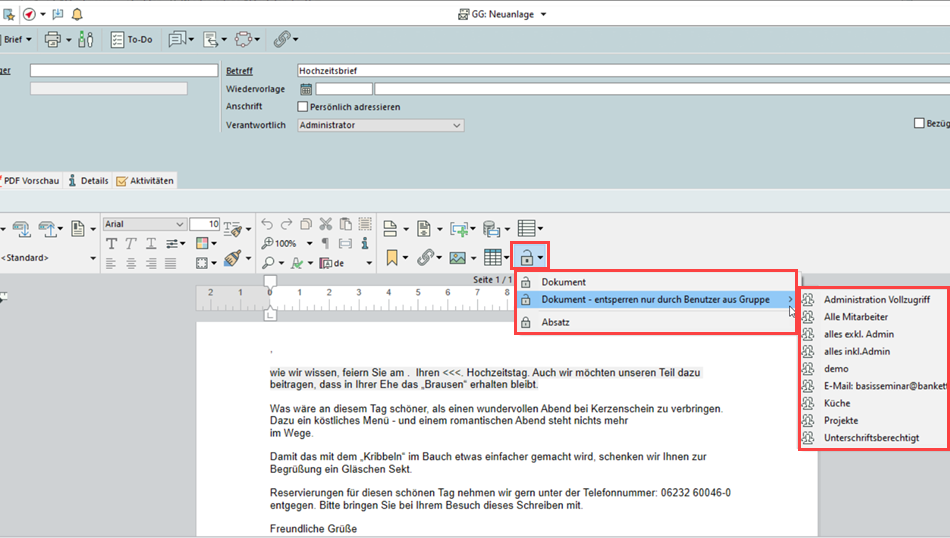 Die Sperrung eines ganzen Dokumentes kann für definierte Benutzerguppen aufgehoben werden. Administrator und Support User können immer entsperren.