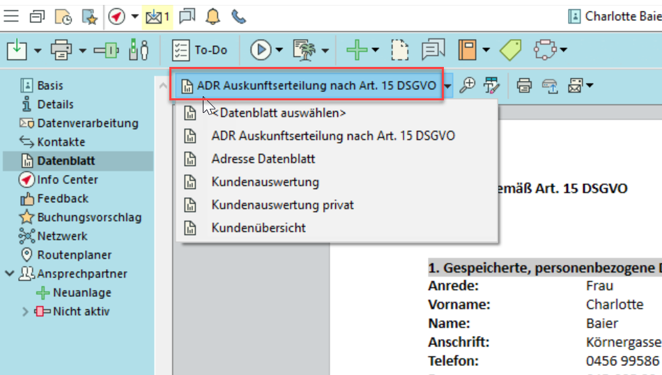 Wählen Sie mit Klick auf die Schaltfläche Datenblatt auswählen Ihr gewünschtes Datenblatt, und öffnen Sie über das Aufklappdreieck weitere Optionen. Aktualisieren Sie die Daten, machen Sie ein bestimmtes Datenblatt zum vorbelegten Standard für sich und/oder andere Mitarbeiter, oder gehen Sie mit entsprechender Berechtigung für die Bearbeitung oder Neuanlage direkt zu den Datenblattvorlagen.