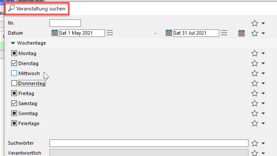 Die Auswahl der Tage erfolgt über Ankreuzkästchen mit drei Zuständen (unbestimmt, ausgewählt, nicht ausgewählt), so dass Sie bestimmte Wochentage bewusst in die Suche ein- oder aus der Suche ausschließen können.