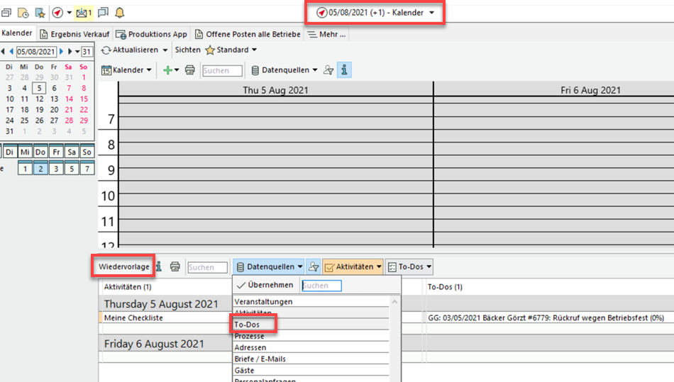 Der To-Do-Eintrag erscheint zum angegebenen Datum auf der Wiedervorlageliste im Info Center der verantwortlichen Mitarbeiter, wenn To-Dos als Datenquelle ausgewählt sind. Filtern Sie ggf. nach Einträgen mit Ziel- oder Wiedervorlagedatum.