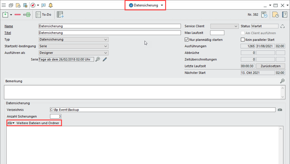 Über den Job "Datensicherung" können wie bereits zuvor beliebige Ordner optional in die Datensicherung integriert werden, sofern sie vom Bp Event Server erreicht werden.