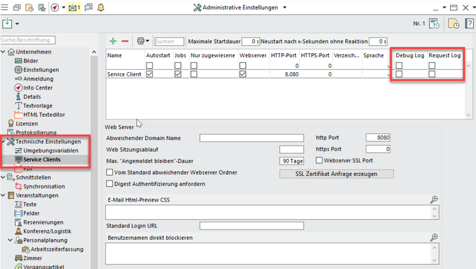 Unter Administration > Technische Einstellungen > Service Clients aktivieren Sie unabhängig voneinander die Request- und Debug-Logs für jeden Service Client einzeln.