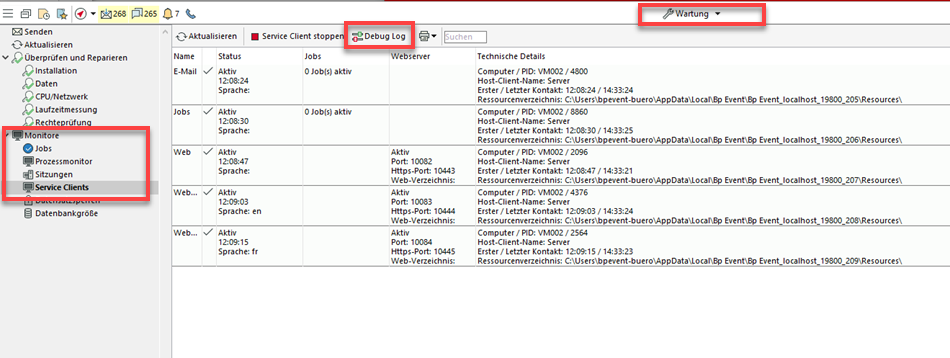 Um das Log auch spontan noch an- oder auszuschalten, während der Service Client läuft, gehen Sie zu Hilfe > Wartung > Monitore > Service Clients. Markieren Sie den gewünschten Client und klicken Sie in der Werkzeugleiste "Debog Log aktivieren bzw. deaktivieren".