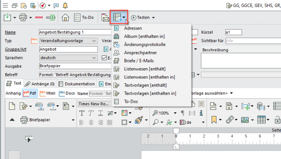 Über die Schaltfläche Verwandte Listen in der horizontalen Werkzeugleiste dieser Datensätze öffnen Sie eine Liste der Objekte, in denen die aktuelle Datensatz enthalten ist, oder die er selber enthält. Beim Löschen erfolgt eine automatische Prüfung und Warnung.