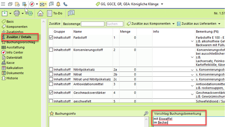 Pflegen Sie die Liste der Vorschlagswerte unter Artikel > Zusätz/Details > Vorschlag Buchungsbemerkung, z.B. für eine Auswahl von Dressings, Beilagen oder Garstufen.