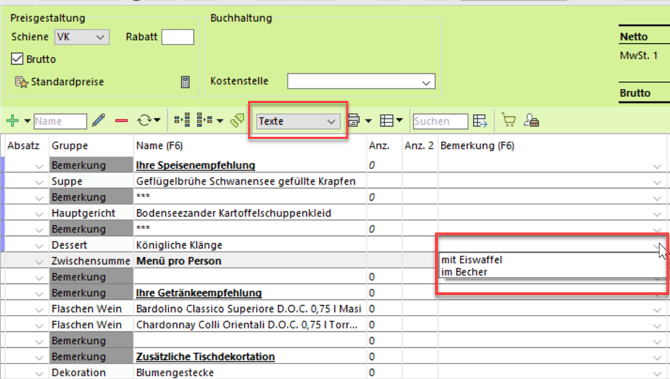 Geben Sie Vorschlagswerte für das Combo-Feld "Bemerkung" in der Liste der Vorgangsartikel (mit Sicht "Texte") vor. Die freie Eingabe bleibt weiterhin möglich.