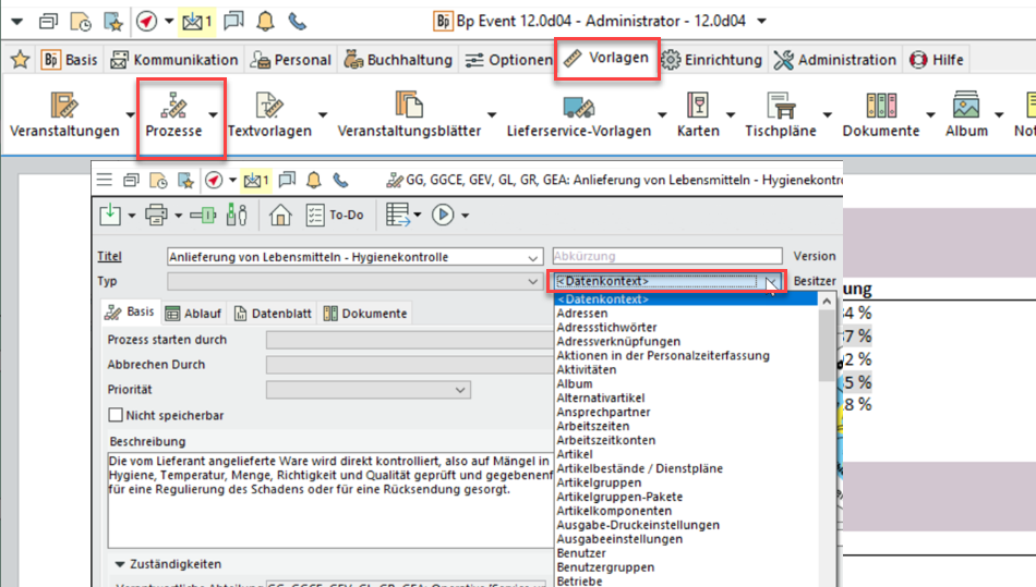 Wenn ein Vorgang ausgewählt ist, werden außerdem Vorlagen mit dem Datenkontext "Vorgänge" angeboten und die Prozesse unter dem Namen des Vorgangs gespeichert.