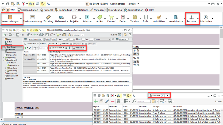 Alle Prozesse zu einer Veranstaltung finden Sie unter Veranstaltung > Info Center mit der Datenquelle "Prozesse" oder unter Basis > Prozesse > Suchen.