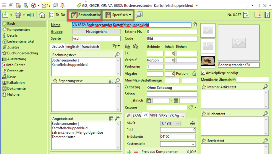 Auf der Basisseite sind jetzt Kundentexte bzw. interne Texte zusammen gruppiert. Artikeleigenschaften wie "Bestandsartikel", "VA-spezifisch" (bei Anlage aus Veranstaltung) oder "Dienstplan" (für Personalartikel) wurden als Icons in die obere Werkzeugleiste verlagert, wo sie mit Klick zu aktivieren oder deaktivieren sind.