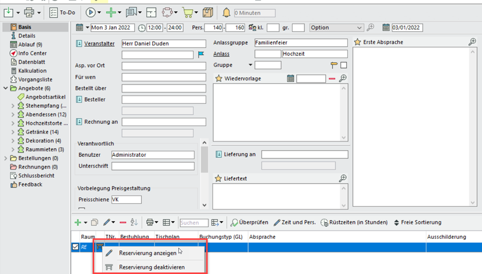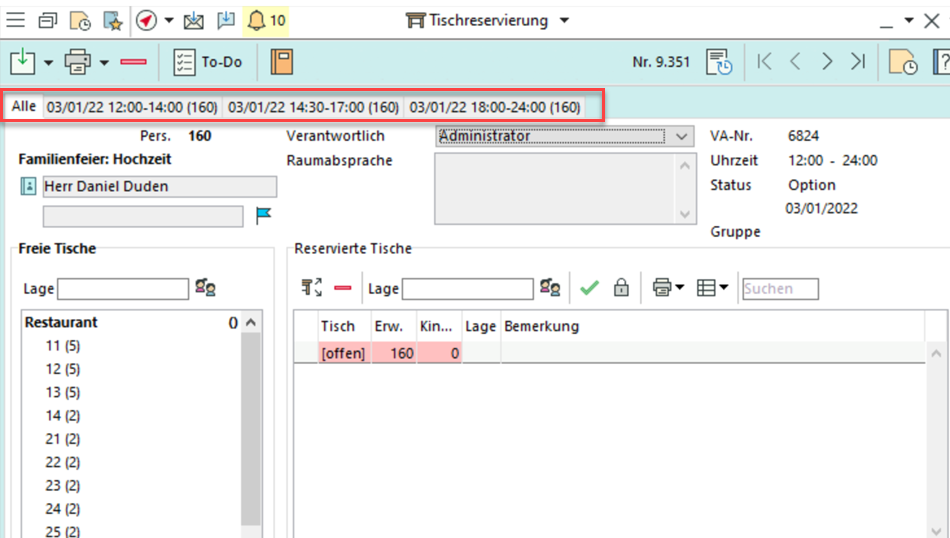 Mit Rechtsklick auf das Icon "Reservierung anzeigen" öffnet sich die Reservierung. Mehrere Reiter sehen Sie, wenn sich die Veranstaltung über mehrere Tage oder innerhalb eines Tages über mehrere Tischreservierungs-Veranstaltungen erstreckt.