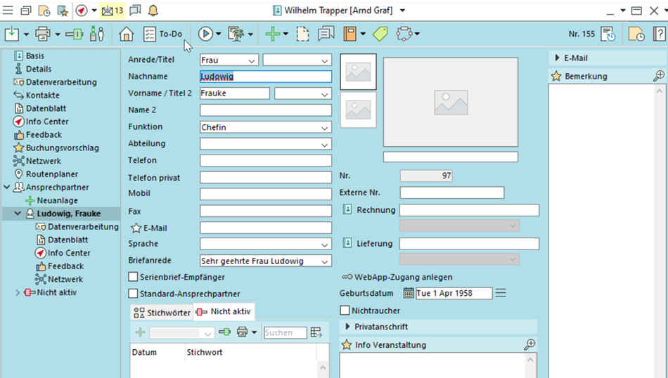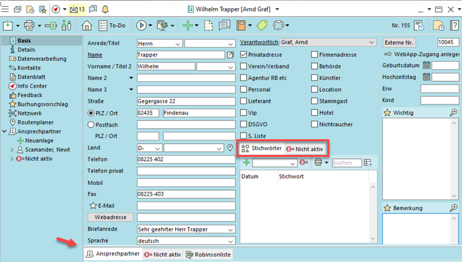 Es werden nur noch die Adresskategorien angezeigt, die auch wirklich verwendet werden, direkt darunter finden Sie die datierten Stichworte. Weitere Tabellendetails, Freifelder und Bemerkungsfelder sind an den rechten Rand des Fensters verschoben, wo sie je nach Bildschirmbreite ein- oder zweispaltig angezeigt werden.