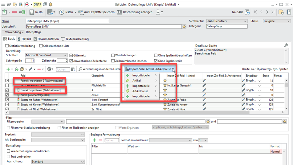Für jede Zieltabelle werden eine separate Spalte für die Importfelder und bei Datenpflegelisten eine separate Formel für die "Importfilter" (Zeilen, die importiert werden sollen) angeboten. Mehrstufige Imports können mit schneller Laufzeit in nur einem Jobschritt ausgeführt werden.
