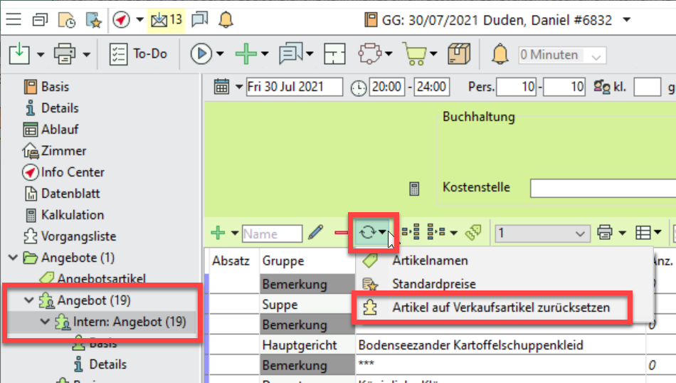 Statt nach Änderungen in der Bestellung die internen Planungsvorgänge ganz neu zu starten, stellen Sie die Vorgangsartikel mit Klick auf Aktualisiseren > Artikel auf Verkaufsartikel zurücksetzen auf den aktuellen Stand der externen Bestellung um.