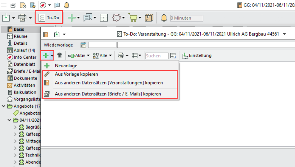 Importieren Sie To-Do-Einträge direkt oder über Datenpflegeliste. Da To-Dos am übergeordneten Objekt, z.B. Adresse, Veranstaltung oder Meldung hängen, darf dieser Datensatz zum Zeitpunkt des Imports nicht in Bearbeitung (gesperrt) sein.