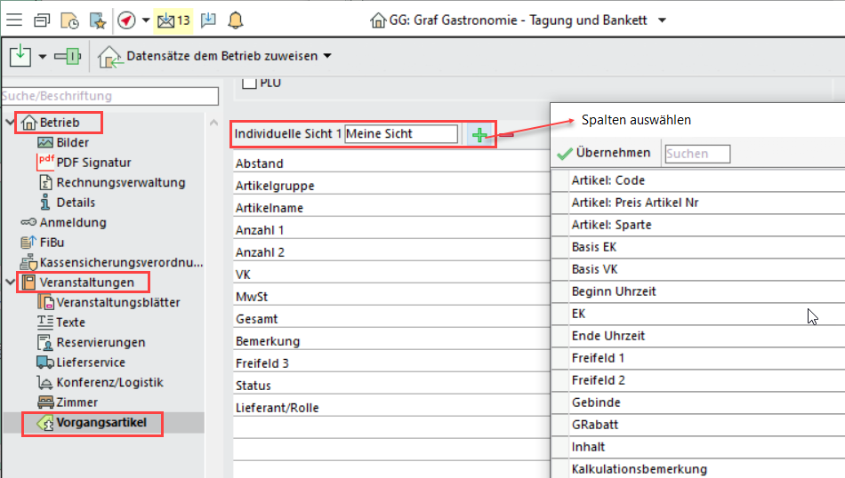 Wählen Sie unter Administration > Allgemeine Einstellungen > Veranstaltungen > Vorgangsartikel die Spalten für Ihre Individuellen Sichten aus. Im Multibetrieb finden Sie die Vorgangsartikel in den Betriebseinstellungen.