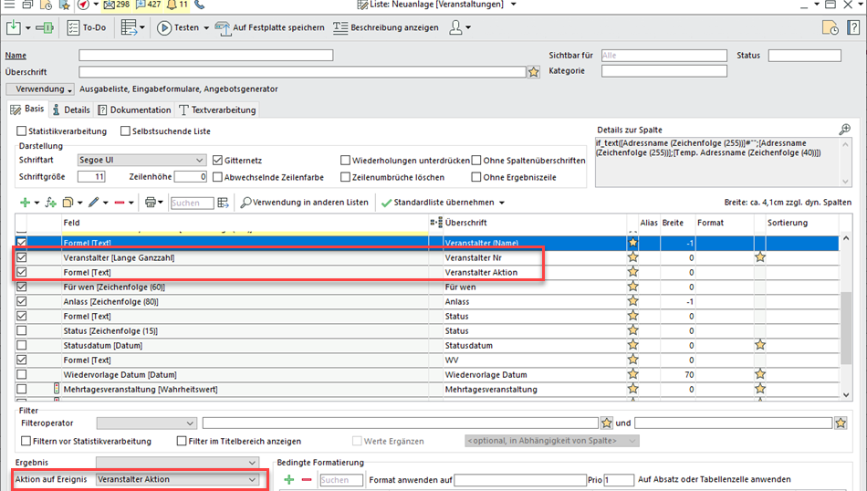 Weisen Sie dazu der Spalte oder dem Datenbankbezug eine Spalte "Aktion auf Ereignis" zu, für die kontextspezifisch beliebig viele Aktionen (getrennt durch Zeilenumbruch) angelegt werden. Die Aktionen funktionieren für spezifische Listen (Reservierungsliste, Tischreservierungsübersicht) und Datenblätter.