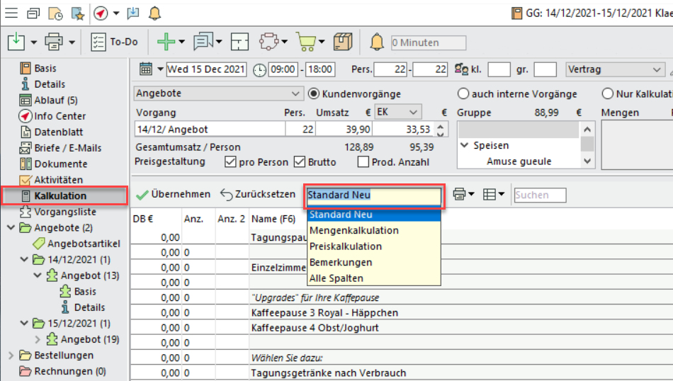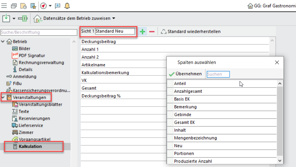 Definieren Sie unter Administration > Einstellungen > Veranstaltungen > Kalkulation bis zu fünf unterschiedliche Sichten auf Basis der möglichen Spalten. Im Multi-Betrieb sind die Sichten pro Betrieb individualisierbar.
