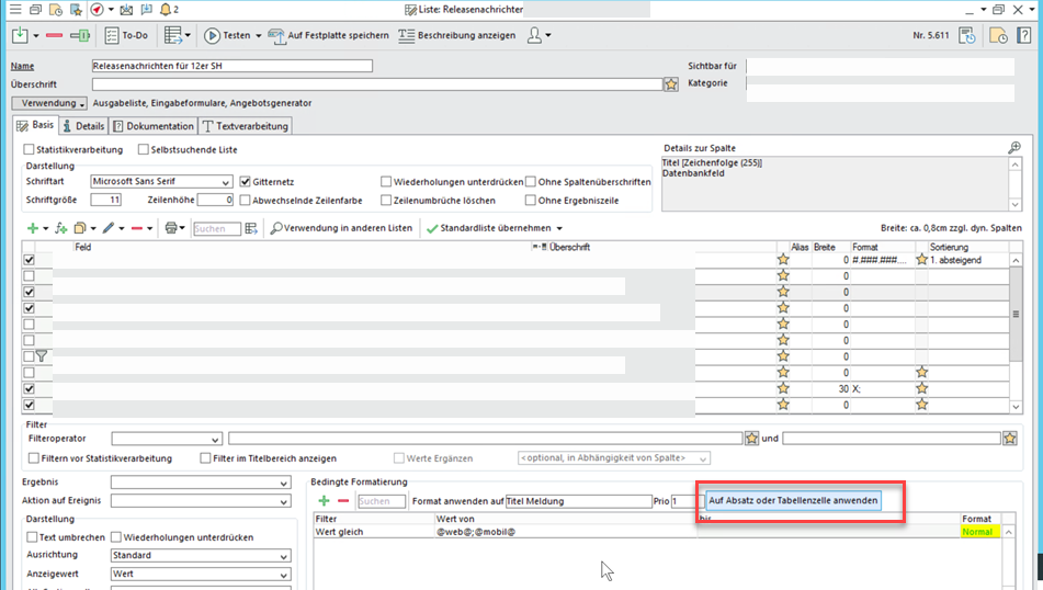 Aktivieren Sie dafür in der Listendefinition Bedingte Formatierung > Auf Absatz oder Tabellenzelle anwenden, und wählen Sie mit Rechtsklick in die Spalte "Format" Hintergrundfarbe, Textfarbe bzw. Textstil aus.