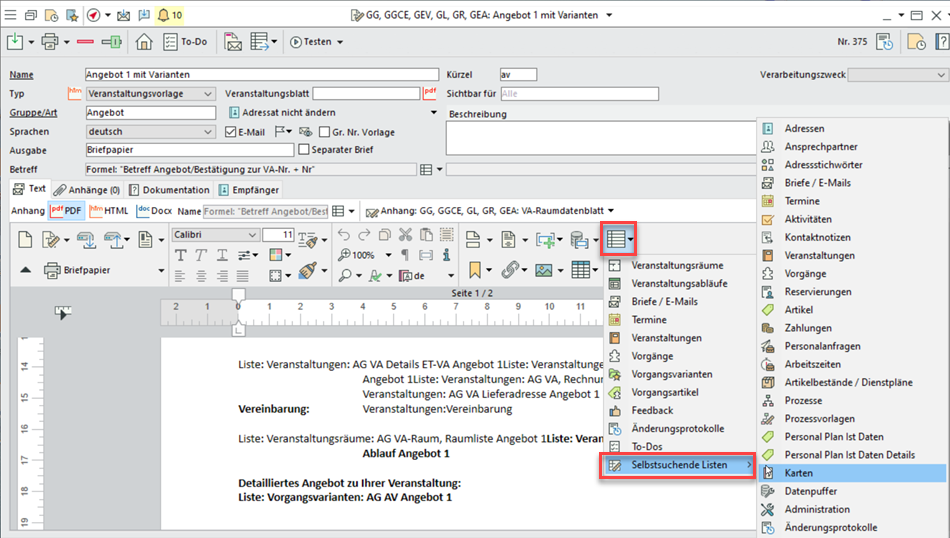 Fügen Sie in Textvorlagen auch selbstsuchende Listen einfach über den Menüpunkt Listen einfügen > Selbstsuchende Listen einfügen in der horizontalen Werkzeugleiste ein.