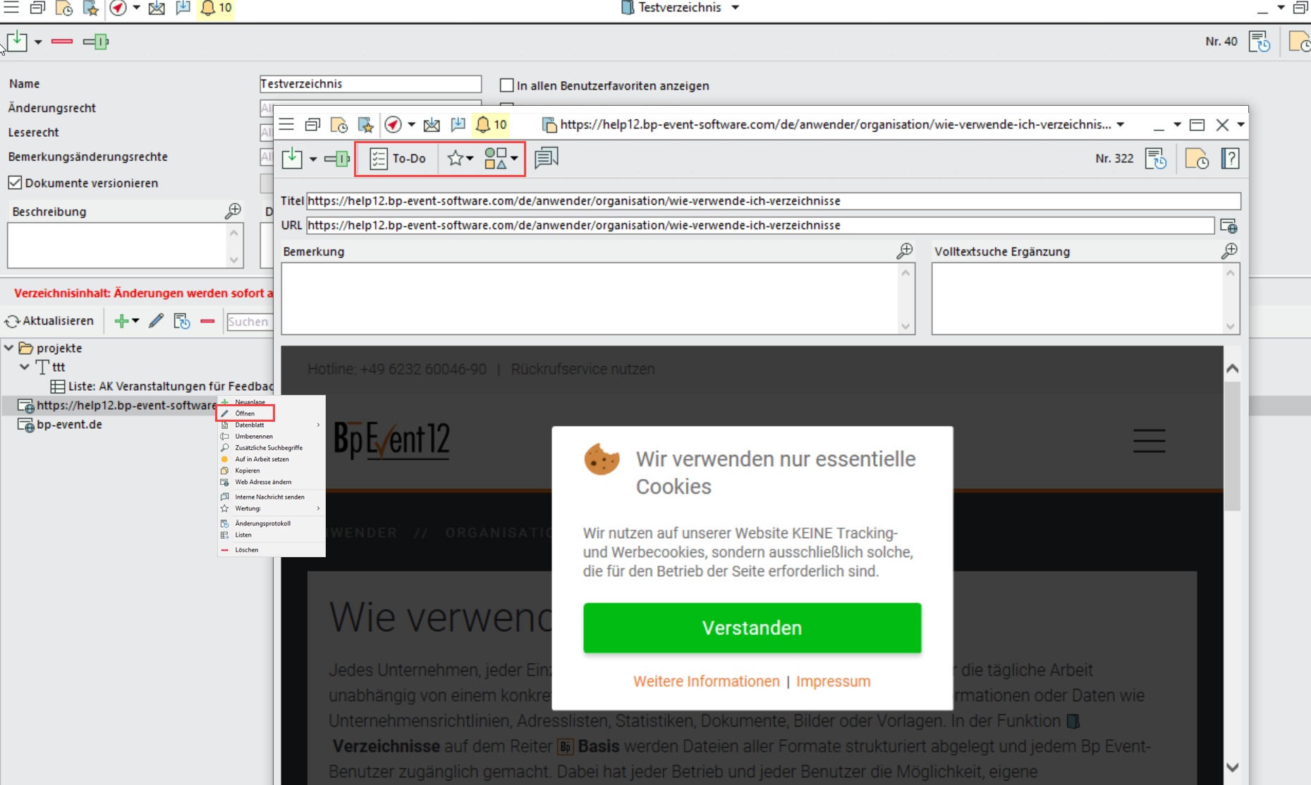 Eingabedialog für Verzeichnisobjekte: Öffnen Sie Verzeichnisobjekte mit Rechtsklick auf den Namen des Objekts und Öffnen . Bei Textverarbeitung, Tabellenkalkulation, HTML etc. können direkt Inhalt und Titel gepflegt werden. Für Objekte aller Art lassen sich Titel, Bemerkung und weitere Felder öffnen. Außerdem legen Sie über die Werkzeugleiste mit Klick auf die Icons To-Do-Listen an, vergeben Bewertungen oder Stichwörter. Die Beschriftung des Ojekts ändern Sie über das Kontextmenü mit Rechtsklick und Umbenennen.