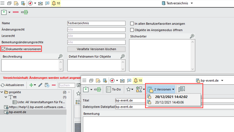 Versionierte Verzeichnisse: die neue Version eines Textdokumentes wird erst beim Speichern gezogen. In der Werkzeugleiste des Dokumentes sehen und öffnen Sie die früheren Versionen mit Klick auf das Icon Änderungsprotokoll anzeigen. Die aktuellste Version des Objektes hat dabei eine stabile Datensatznummer.