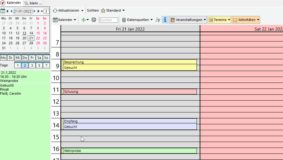 Persönliche Termine werden weiterhin in gelb (offen), grün (Zusage) oder rot (Absage) markiert.