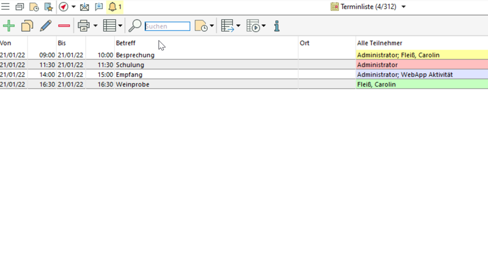 Die Farbgebung findet sich in der Standardliste der Terminsuche wieder und kann über das neue berechnete Feld "Eigener Status" in individuelle IC-Listen und Terminlisten übernommen werden: