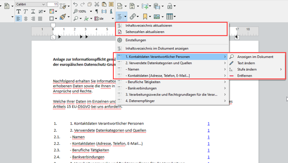 Einzelne Überschriften ändern Sie mit Klick auf den Eintrag und Auswahl der verfügbaren Menüpunkte (Anzeigen, Text ändern, Stufe ändern oder Entfernen).