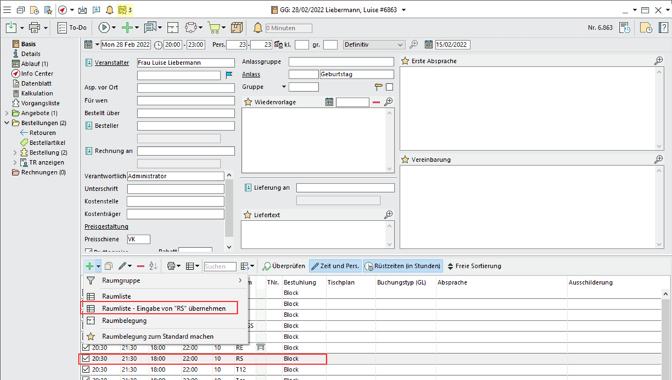 Wählen Sie erst nur einen Raum aus der Raumliste aus und geben Sie für diesen Raum individuelle Zeiten, Personenzahlen etc. ein. Markieren Sie diesen Raum dann als Muster, um mit Klick auf die Schaltfläche Hinzufügen die neue Option Raumliste - Eingabe übernehmen angeboten zu bekommen.
