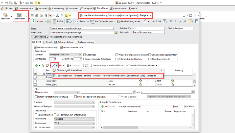 Um vorhandene oder halbfertige Listen auf eine neue Basis-Tabelle umzustellen, wenn sich das im Nachhinein als sinnvoller erweist, gibt es die neue Funktion "Listenbasis auf "..." entlang "..." umstellen".