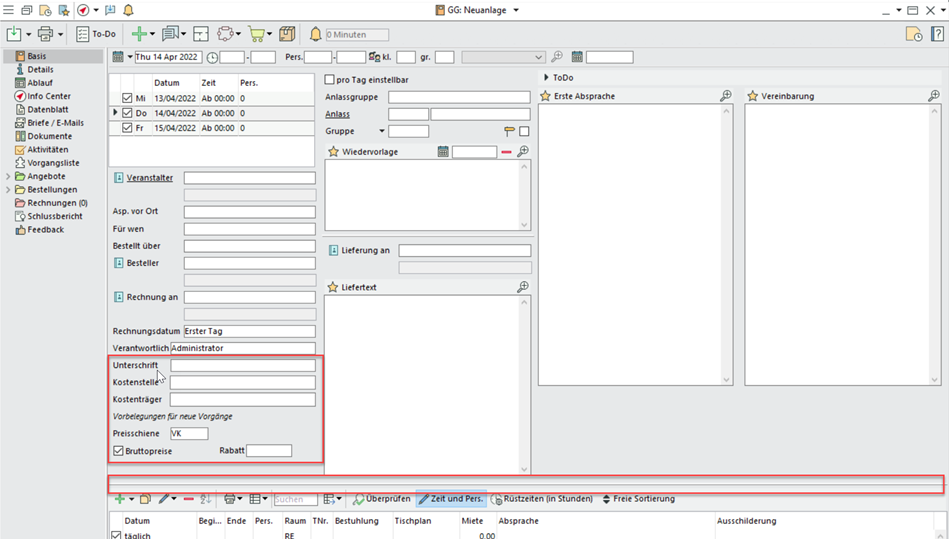 Das Eingabefenster der Mehrtagesveranstaltung wurde an das der Eintagesveranstaltung angepasst. Außerdem kann die Aufteilung des Fensters über einen horizontalen Splitter manuell so verschoben werden, dass die Raumliste nicht mehr als die notwendige Höhe in Anspruch nimmt.